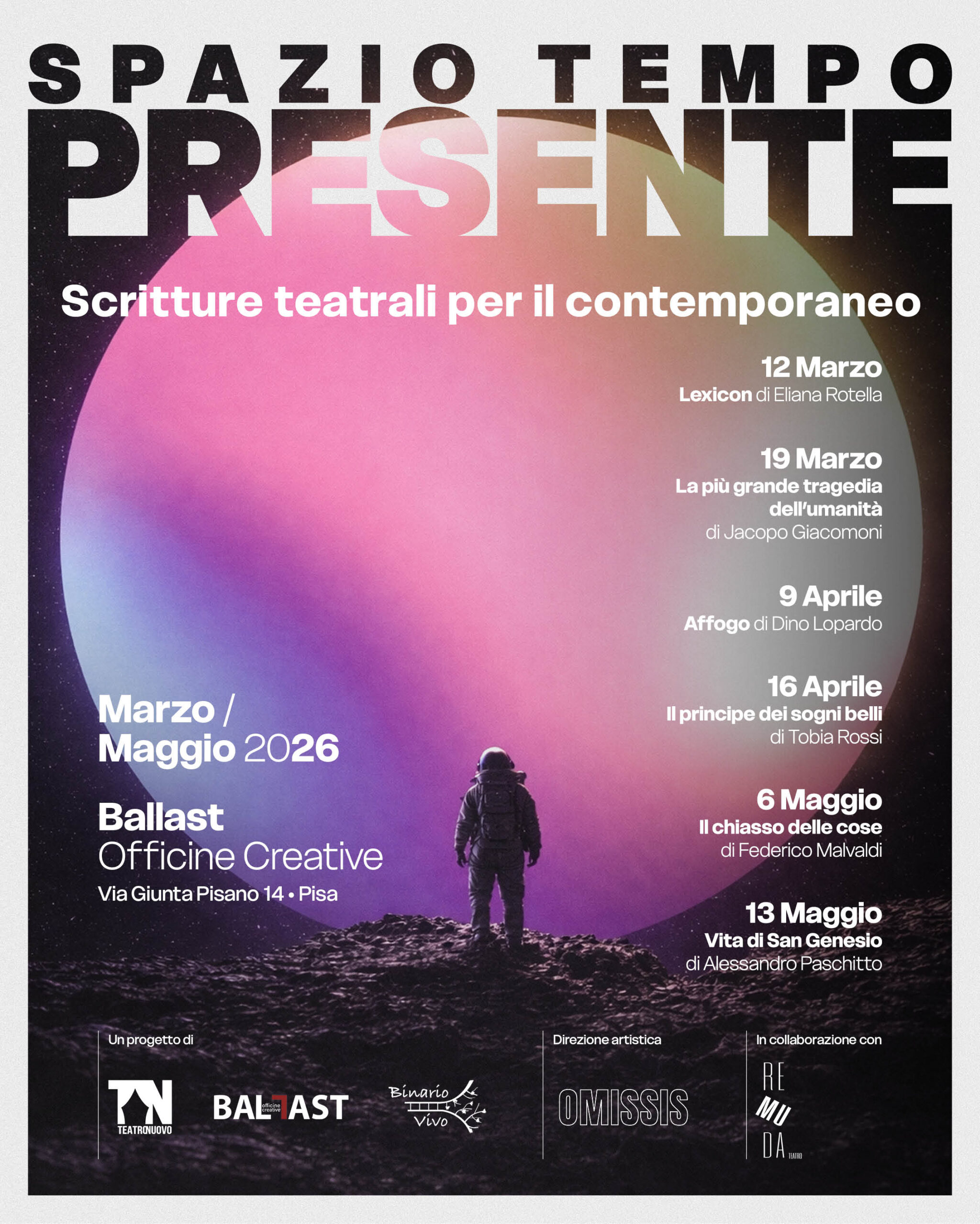 La rassegna si svolgerà tra marzo e maggio 2026 e nasce come primo gesto programmatico di Ballast: una dichiarazione d’intenti che mette al centro la scrittura per la scena, il rapporto con il presente e il sostegno concreto ai percorsi artistici emergenti.